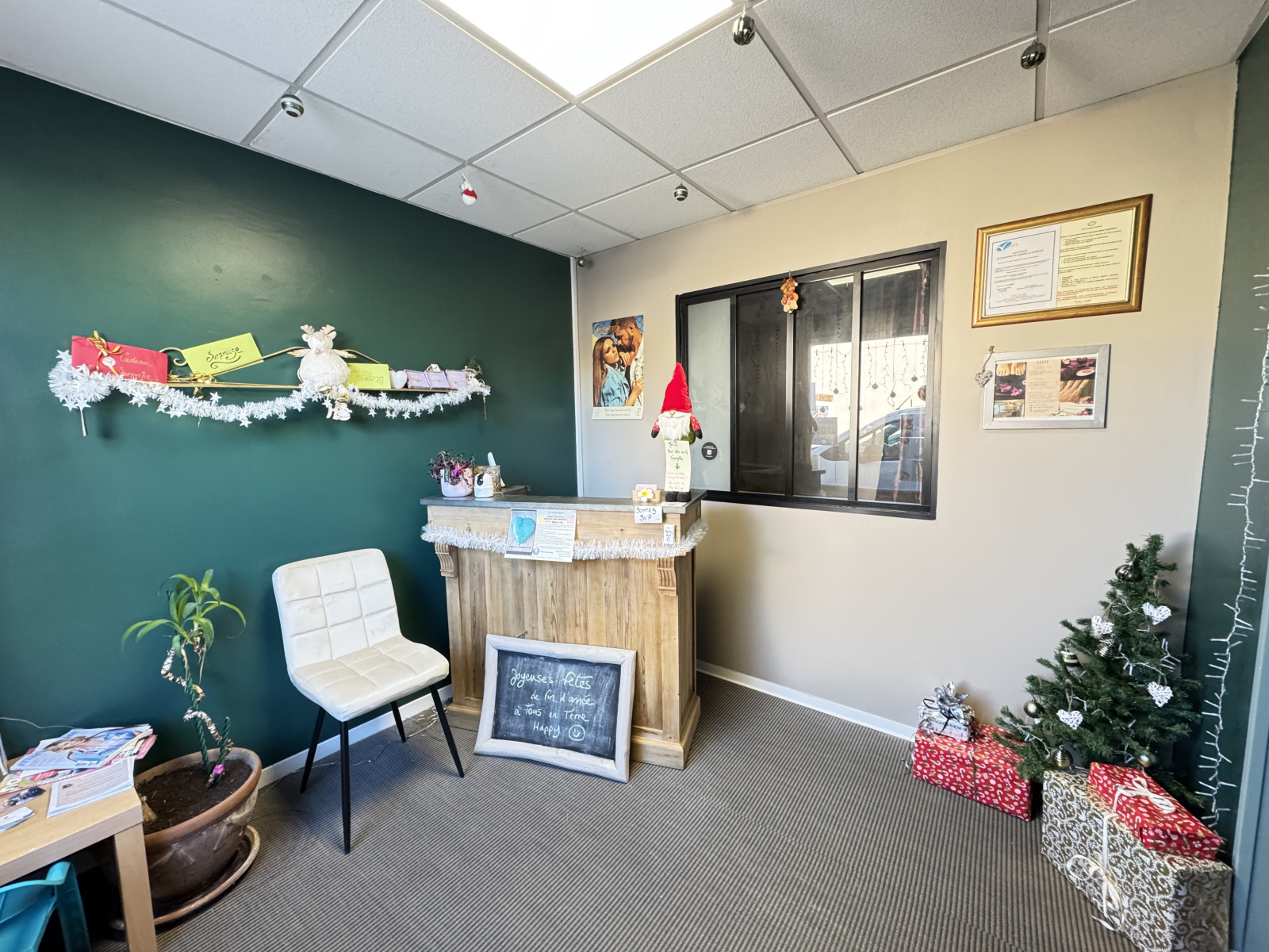 Local professionnel 4 pièces comprenant une entrée/accueil, une salle d'attente, deux bureaux ou salle de soins, un WC séparé, une cuisine ou salle de pause, deux pièces pour stockage.